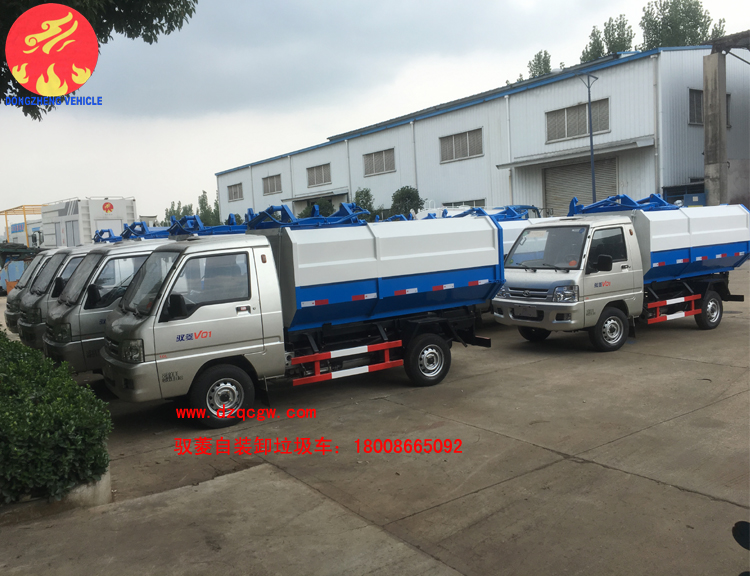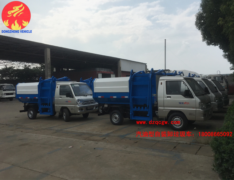 送往廣西的十五臺福田馭菱小型自裝卸式垃圾車已經調試完畢下線待發,該小型自裝卸式垃圾車采用2370mm軸距,柳州五菱國五汽油61馬力發動機,5檔箱,真空胎,垃圾車容積為3個方。